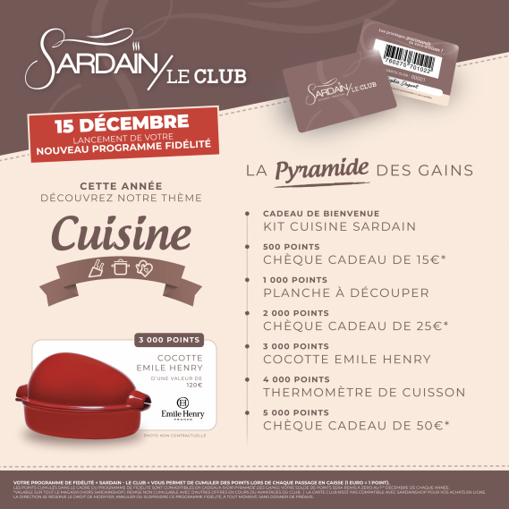 Suite à votre inscription en magasin ou en ligne, nous aurons le plaisir de vous remettre votre carte personnelle du Club Sardain.